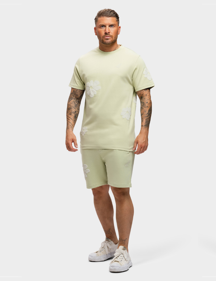 De 2LEGARE Flower Combi-Set in mintgroen is een zomerse set bestaande uit een T-shirt en bijpassende short. Beide items zijn voorzien van ton-sur-ton geborduurde bloemenprints en een subtiel 2LEGARE-logo. Gemaakt van een comfortabele, zachte katoenmix met een relaxte pasvorm. Het T-shirt heeft een ronde hals en korte mouwen, en de short is uitgerust met een elastische tailleband en steekzakken. Perfect voor een opvallende, maar casual zomerlook.