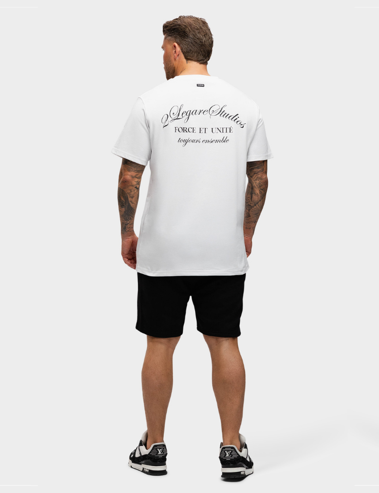 Het 2LEGARE Force Et Unité T-Shirt is een heren t-shirt met een regular fit. Gemaakt van zacht katoen voor optimaal draagcomfort. Het shirt is uitgevoerd in donkergroen en voorzien van een witte opdruk op zowel de borst als de rug. Op de borst staat het 2LEGARE Studios-logo met de tekst "Force et Unité - toujours ensemble". De rug toont dezelfde tekst in grotere vorm. Het t-shirt heeft een ronde hals en korte mouwen.