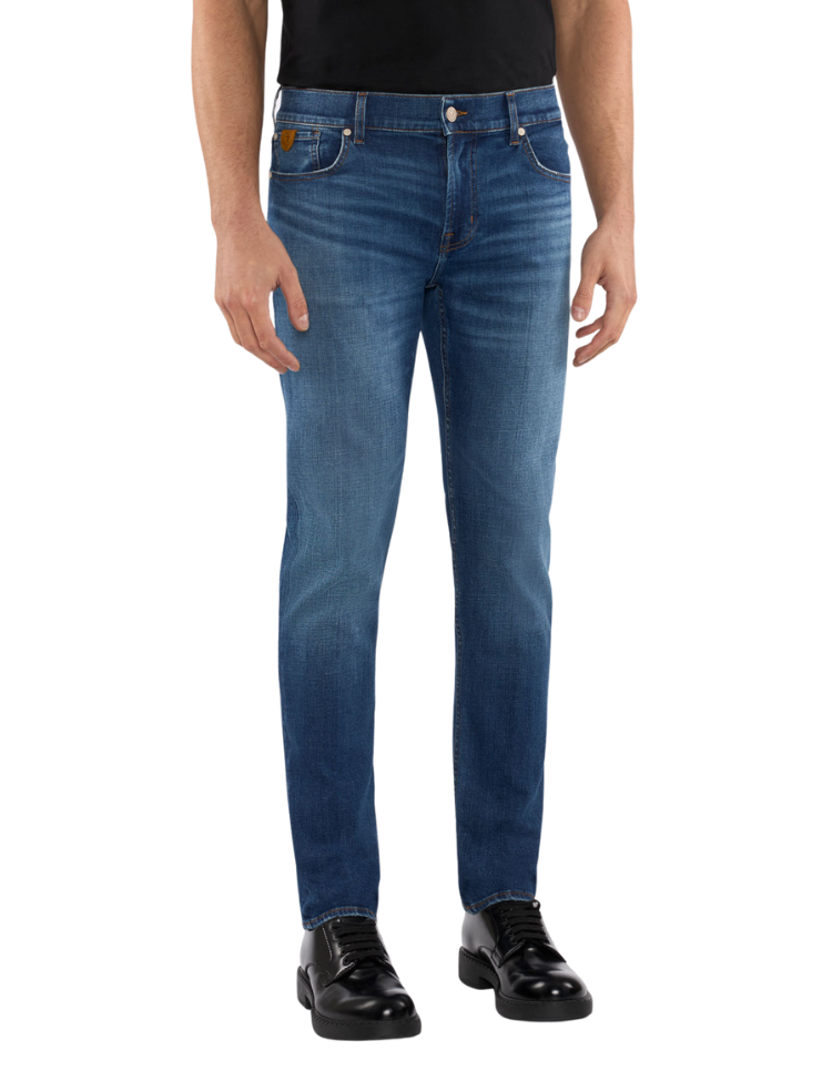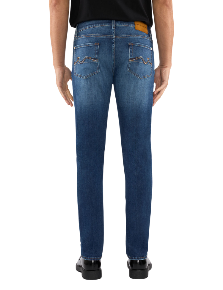 Deze slim fit heren jeans biedt een moderne pasvorm met een klassieke uitstraling. De jeans is vervaardigd uit hoogwaardige stretchdenim, waardoor hij comfortabel zit en zich perfect aanpast aan je lichaamsvorm. De kleur is een tijdloze mediumblauwe wassing met subtiele fading op de bovenbenen en knieën, wat zorgt voor een casual en toch verzorgde look.