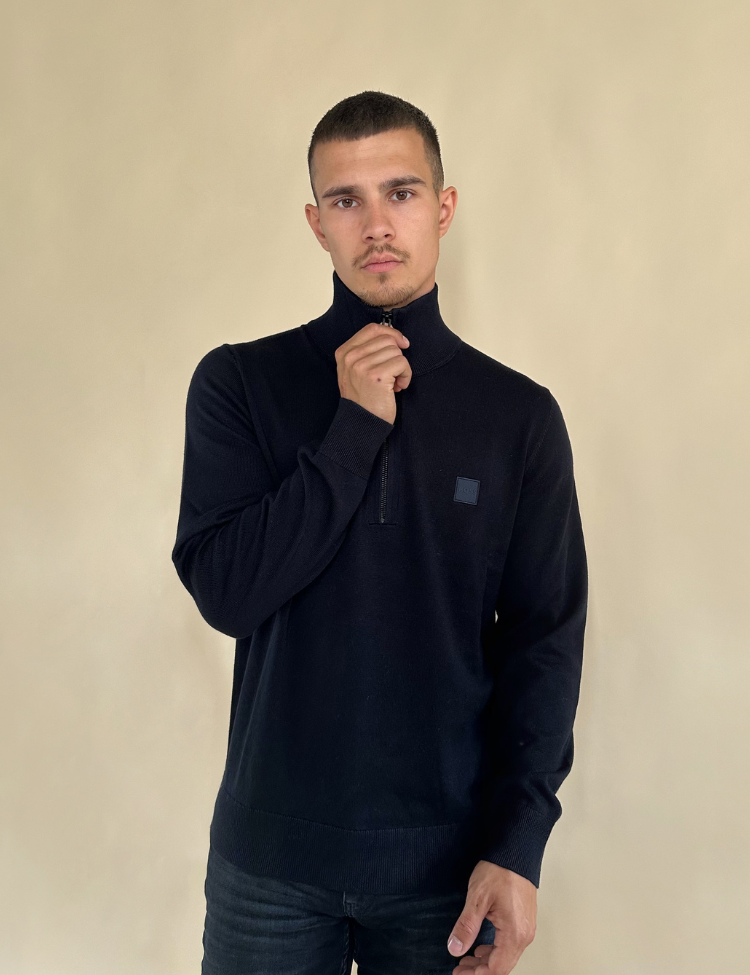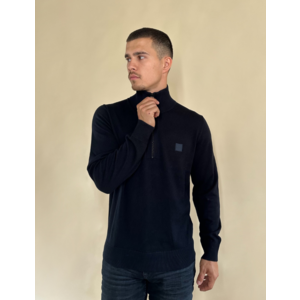 Til je garderobe naar een hoger niveau met de Hugo Boss Kanobix trui in dark blue. Deze verfijnde trui combineert comfort en klasse met een moderne uitstraling. Het model is voorzien van een halflange rits en een opstaande kraag voor een sportieve en tegelijkertijd elegante look. Gemaakt van een hoogwaardige mix van 95% katoen en 5% kasjmier, biedt de trui een zacht draagcomfort en een luxe feel.