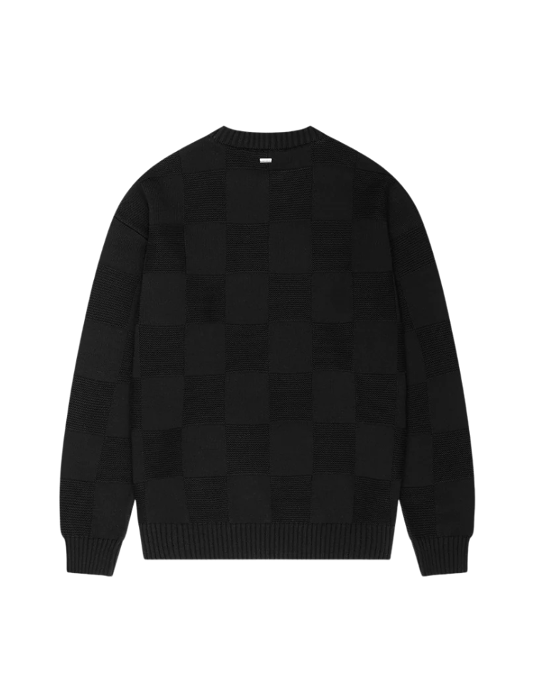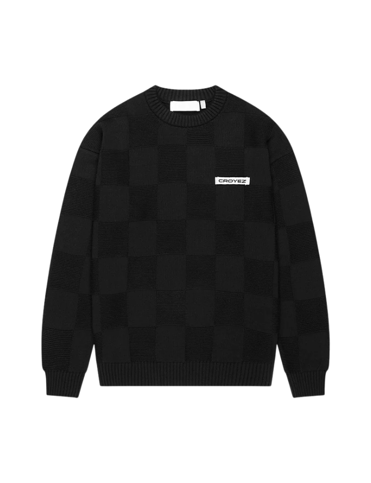 De Croyez Checkerboard Knit Sweater in zwart is een stijlvolle trui die comfort en karakter combineert. Het ontwerp is voorzien van een subtiel checkerboard-patroon in jacquardstructuur, wat zorgt voor een moderne, maar tijdloze uitstraling. De trui is gemaakt van een zachte katoenmix en heeft een regular fit met geribde boorden aan de mouwen, zoom en kraag. Op de borst staat een wit geborduurd Croyez-logo, wat het geheel een minimalistische maar herkenbare touch geeft. Perfect voor dagelijks gebruik of als statement piece binnen een casual outfit.