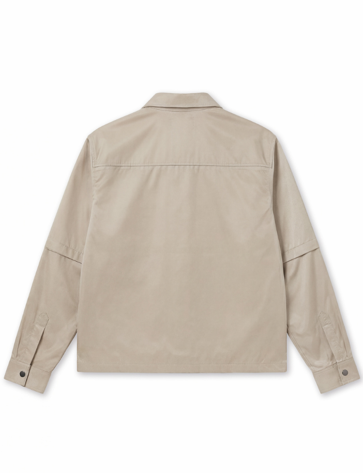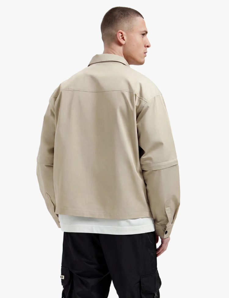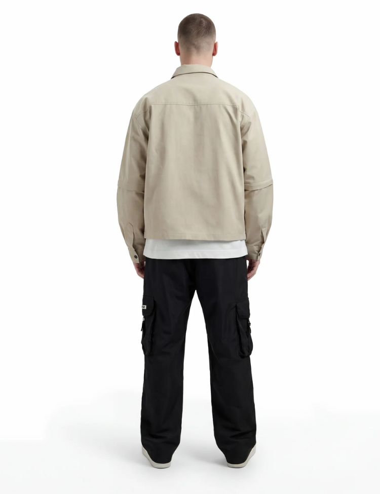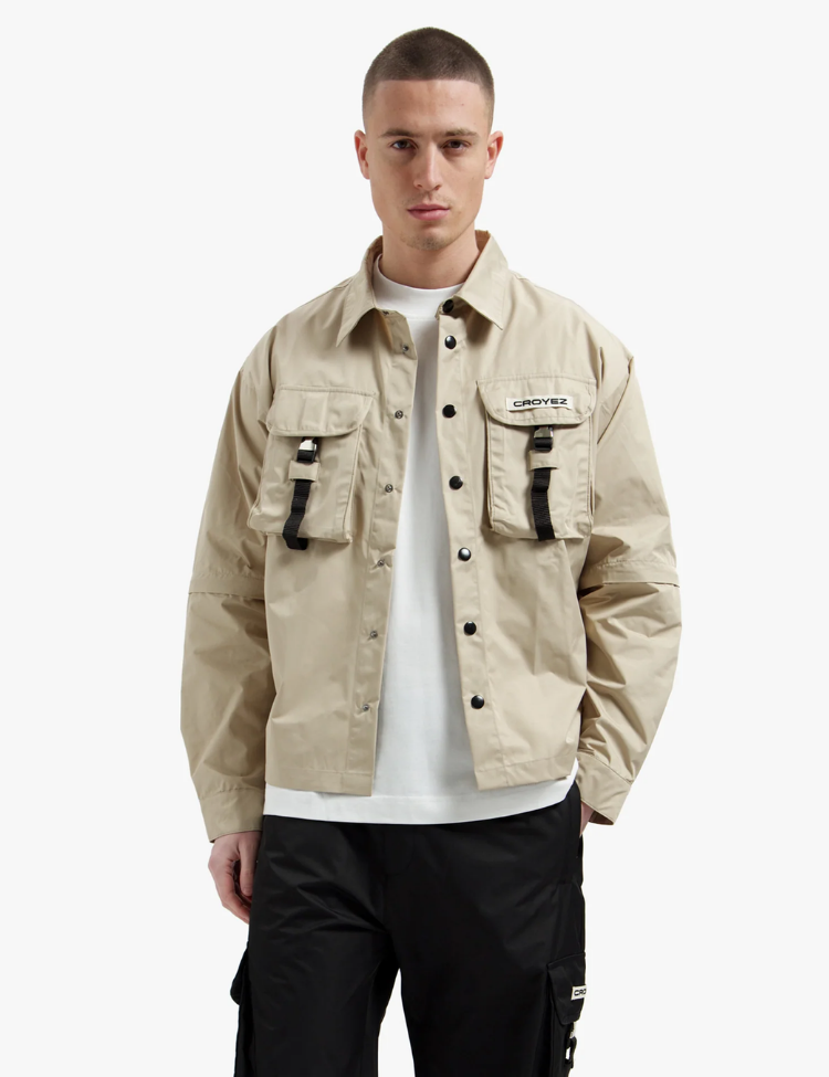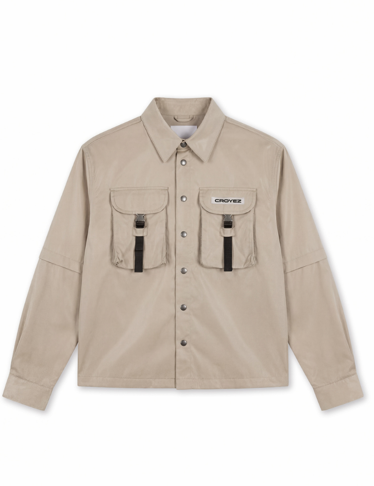 Dit beige nylon jack combineert streetwear met functionaliteit. Het lichtgewicht nylon materiaal geeft je bewegingsvrijheid terwijl de klassieke kraag een nette touch toevoegt. Op de borst vind je twee opvallende borstzakken met zwarte contrasterende banden en metalen gespen voor een stoere utility-look. De doorlopende knoopsluiting loopt over de gehele voorkant. Het Croyez logo staat subtiel op de linkerborstzak. Dit oversized jack heeft een relaxte pasvorm die perfect aansluit bij de hedendaagse streetwear esthetiek.