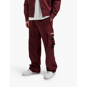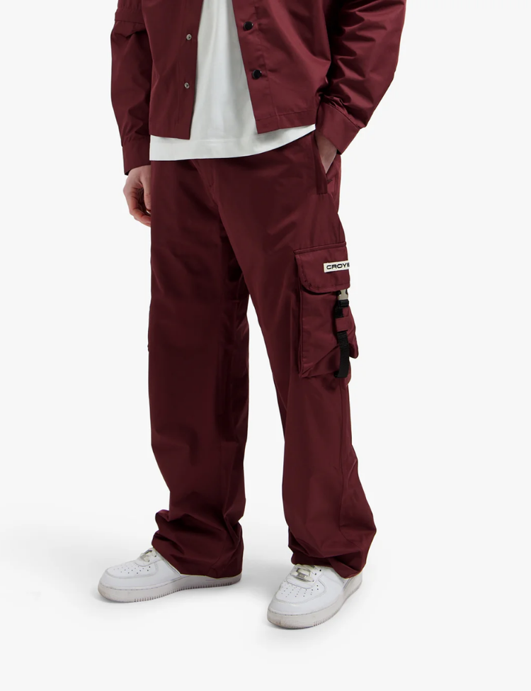 Deze nylon broek van Croyez heeft een relaxte pasvorm met elastische tailleband voor extra comfort. De cargobroek is voorzien van twee ruime zijzakken met klep en zwarte gespen voor een stoere touch. Het lichtgewicht nylon materiaal zorgt voor bewegingsvrijheid terwijl je er stijlvol uitziet. Een subtiel wit label met Croyez-branding siert de linkerzak. De wijde pijpen geven deze burgundy cargobroek een trendy streetwear look die perfect past bij je casual garderobe.