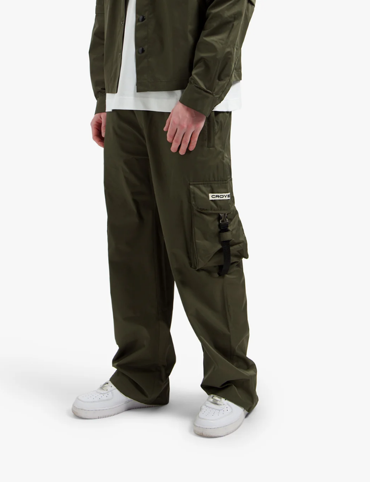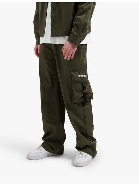 Deze nylon broek van Croyez combineert stoere utility-stijl met moderne streetwear. Het dusty olive groene design heeft een relaxed silhouet met cargo zakken aan de zijkanten. De elastische tailleband met trekkoord zorgt voor comfort en de perfecte fit. Het geweven Etiquette label op de bovenbeen geeft je look die exclusieve touch. De lichte nylon stof voelt soepel aan en de wijde pijpen creëren een laid-back vibe die bij jouw lifestyle past.