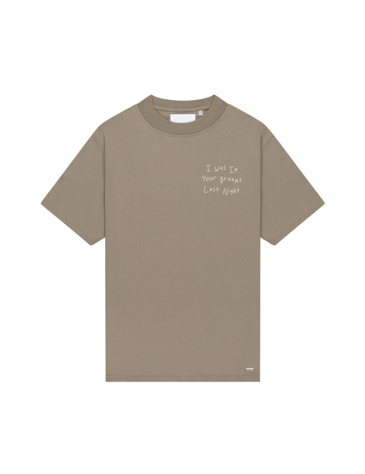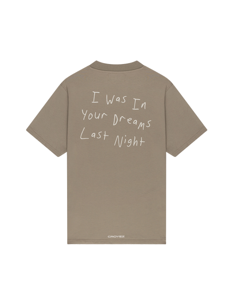 Laat een blijvende indruk achter met het Croyez In Your Dreams T-Shirt in de kleur Dusty Olive. Dit T-shirt is gemaakt van premium katoen voor een comfortabele pasvorm en ademend draagcomfort. De voorzijde toont subtiel de tekst "I Was In Your Dreams Last Night", terwijl de achterkant dezelfde quote in grotere, opvallende print draagt. Het minimalistische design in combinatie met een speelse boodschap maakt dit shirt een perfecte keuze voor een casual streetwear look met karakter.