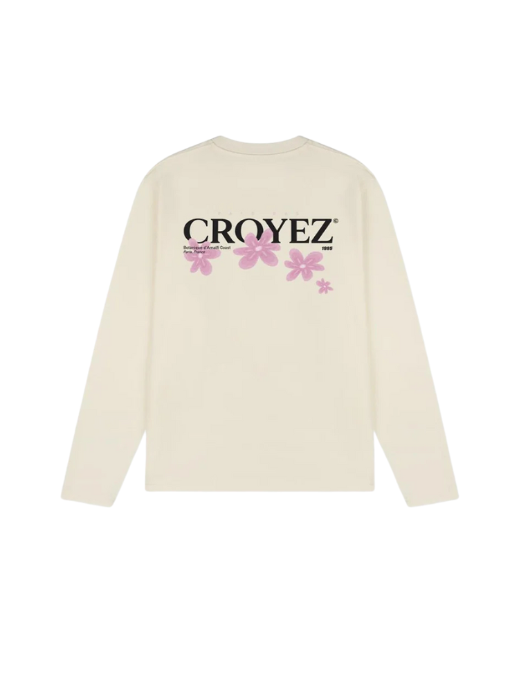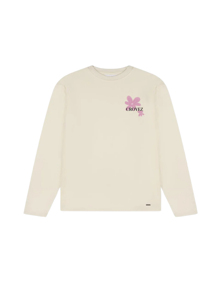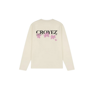 Deze off-white longsleeve met lange mouwen heeft een ronde hals en relaxte pasvorm. Op de voorkant zie je een roze bloemenprint met het Croyez logo op de borst. De achterkant toont een grotere print met Croyez tekst en bloemmotieven in dezelfde roze tint. Het shirt heeft een rechte zoom en is uitgevoerd in zacht katoen voor optimaal draagcomfort tijdens je dagelijkse activiteiten.
