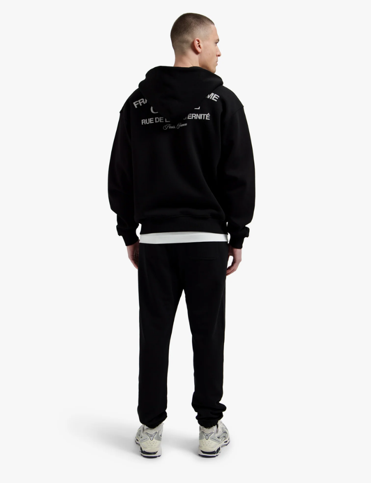 Deze zwarte hoodie van Croyez combineert streetwear met Parijse flair. Het vest heeft een doorlopende ritssluiting en capuchon voor extra comfort. Op de borst zie je subtiele tekstprint met "Fraternité Ultime" en het Croyez-logo. De achterzijde toont grotere witte letterprint met "Fraternité Ultime", "Croyez" en "Rue de la Fraternité Paris France". Steekzakken aan beide zijden maken deze zip-up hoodie praktisch voor dagelijks gebruik. De ribboorden bij de mouwen en zoom zorgen voor een perfecte pasvorm.