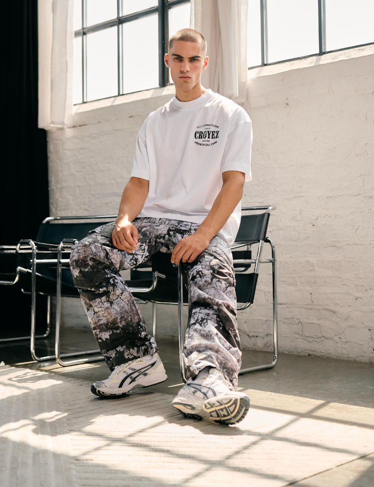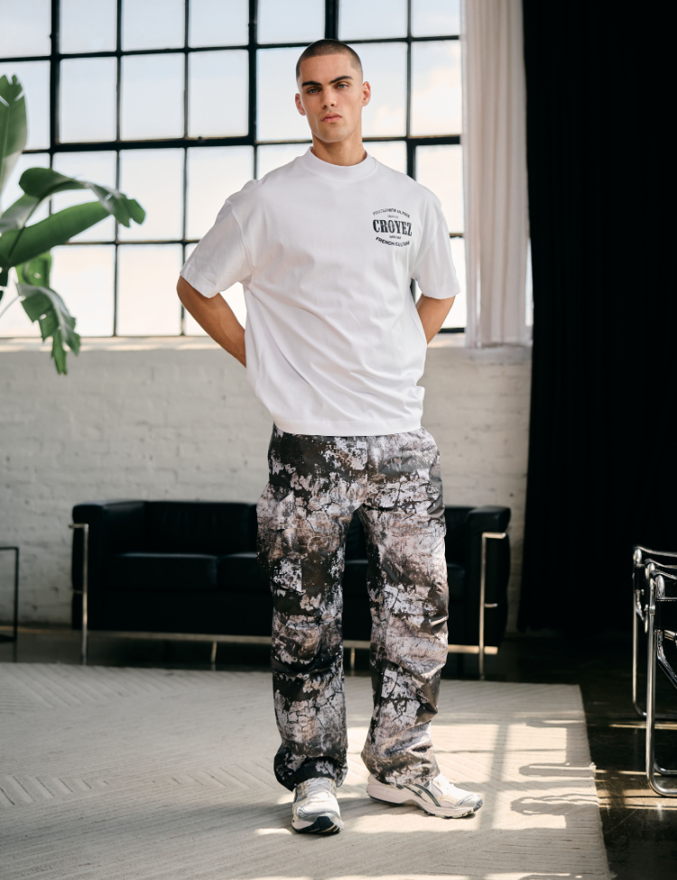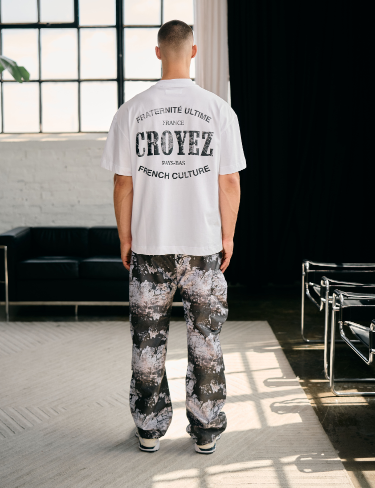 De Croyez Parachute Ripstop Pants - Black Oil is een cargo-broek gemaakt van lichtgewicht ripstop nylon. De broek is voorzien van een all-over 'Black Oil' print, een elastische tailleband met trekkoord en verstelbare boorden aan de onderzijde. De pasvorm is recht en ontspannen. Aan weerszijden bevinden zich meerdere zakken, waaronder twee cargo-zakken op de pijpen. Het gebruikte ripstop-materiaal is scheurvast en geschikt voor langdurig gebruik.