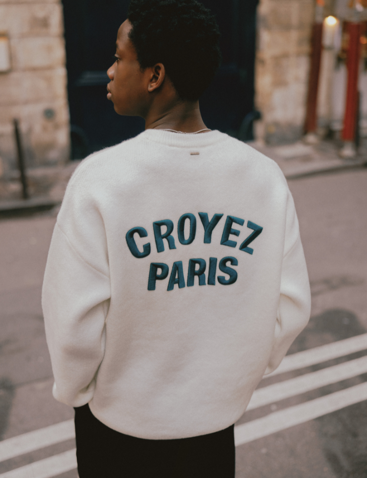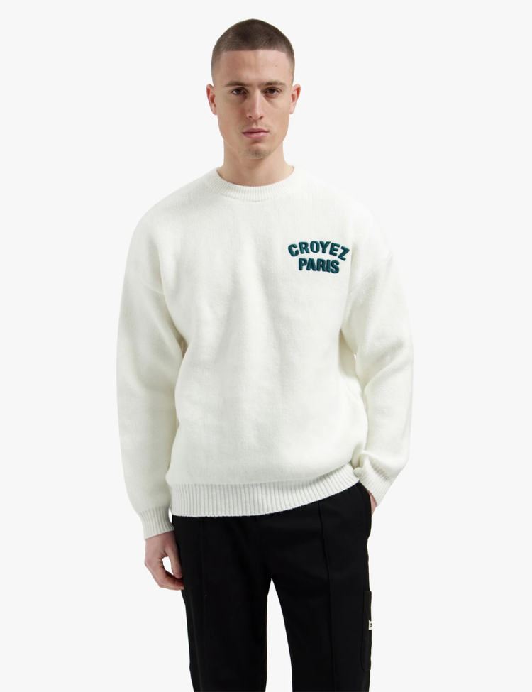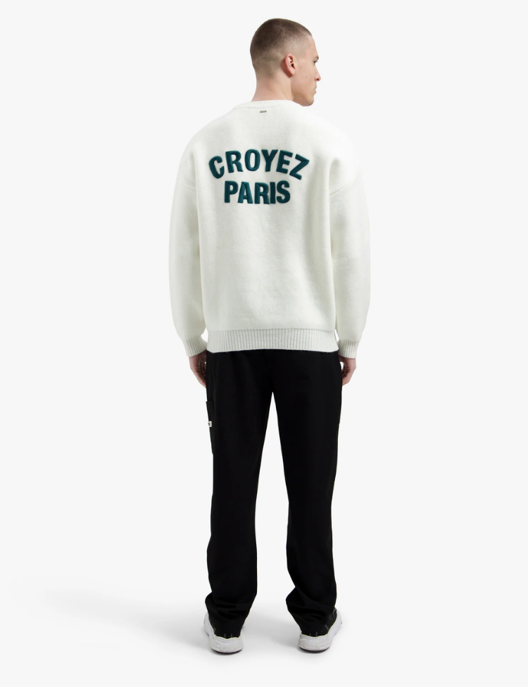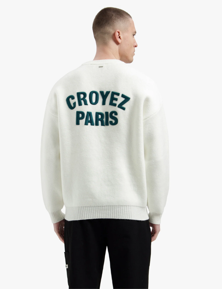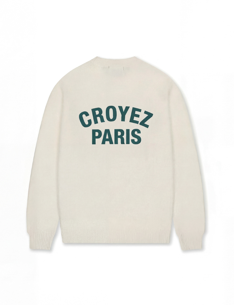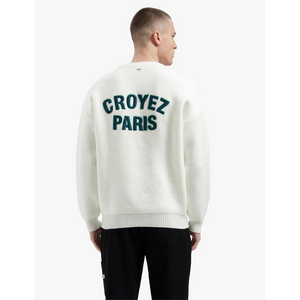 Deze gebreide trui in off-white combineert comfort met een relaxte uitstraling. Het knitwear design heeft een klassieke ronde hals en lange mouwen met geribde boorden bij de polsen en zoom. Op de borst staat "CROYEZ PARIS" in groene letters, terwijl dezelfde tekst groot op de achterkant pronkt. De zachte breistof voelt aangenaam aan en geeft je look een casual twist. Perfect voor wie houdt van comfortabele streetwear met een knipoog naar Parijse stijl.