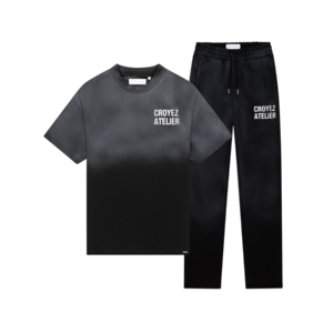 De Croyez Sprayed Atelier Combi-set - Black bestaat uit een t-shirt en straight leg jogger, beide voorzien van een kenmerkende gesprayd zwart-tot-donkergrijze kleurverloop. Het contrasterende witte "Croyez Atelier" logo op borst en broekbeen zorgt voor een krachtige en herkenbare branding.