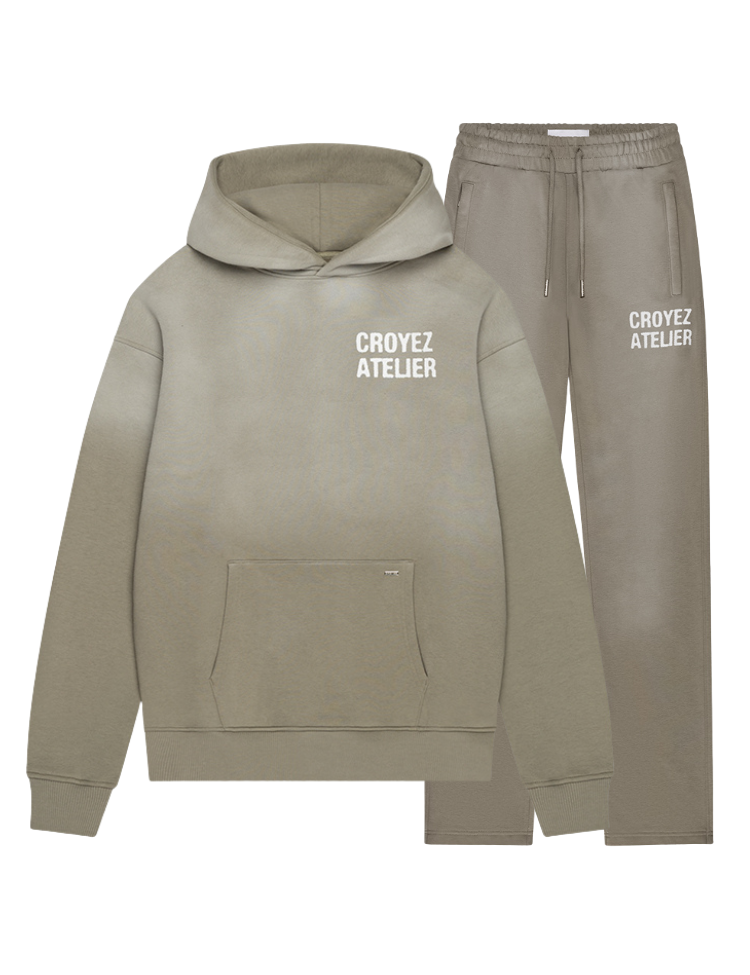 De Croyez Sprayed Atelier Combi-set in Dusty Olive combineert een comfortabele hoodie met een bijpassende straight leg joggingbroek. Beide items zijn uitgevoerd in een gespoten kleurverloop met opvallende ‘CROYEZ ATELIER’-branding in het wit. Gemaakt van zachte katoenmix en ontworpen voor dagelijks gebruik met een moderne pasvorm. De hoodie heeft een ruime capuchon, kangoeroezak en geribde boorden. De broek heeft een rechte pasvorm, elastische tailleband met trekkoord en meerdere zakken. Ideaal als stijlvolle set of los te dragen.