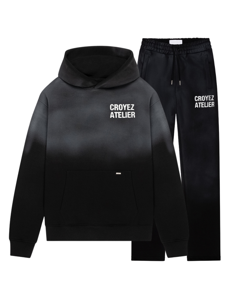 De Croyez Sprayed Atelier Hoodie Combi-set - Black is een modern streetwear-pak bestaande uit een comfortabele hoodie en een bijpassende straight leg jogger. De set valt op dankzij het unieke sprayed kleurverloop van donkergrijs naar diepzwart, afgewerkt met het iconische “Croyez Atelier” logo in wit op zowel de borst als het been.