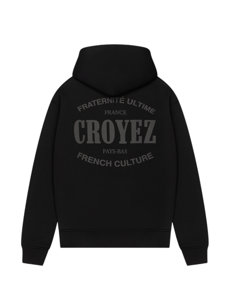 Deze zwarte joggingset combineert comfort met street style. De hoodie heeft een capuchon met koordjes en een kangoeroezak voor je essentials. Op de borst staat een ovale Croyez stamp print met tekst in French Culture stijl. De bijpassende joggingbroek heeft een elastische tailleband met trekkoord en dezelfde Croyez branding op het bovenbeen. Beide items zijn voorzien van een ribboord afwerking bij de zoom en manchetten voor een perfecte fit.