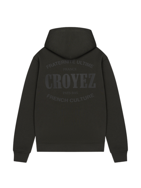Deze donkergroene combiset bestaat uit een hoodie en bijpassende joggingbroek. De hoodie heeft een stomp-print op de borst met "CROYEZ" tekst en een kangoeroebuik. De joggingbroek is voorzien van een elastische tailleband met trekkoord en dezelfde merknaam op het bovenbeen. Dit matching trainingspak combineert sportieve comfort met streetwear stijl voor je dagelijkse look.