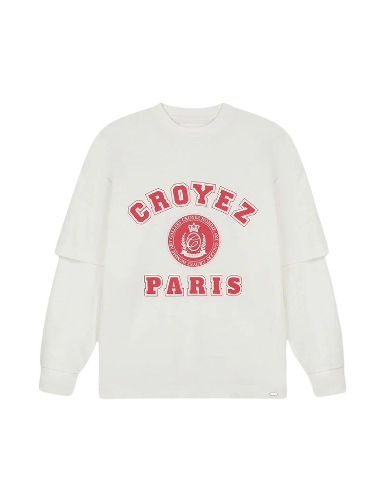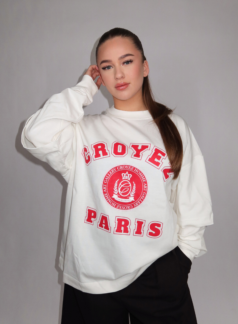 Deze off-white longsleeve van Croyez combineert sportieve stijl met opvallende rode letterprints. Het shirt heeft een relaxte pasvorm met ronde hals en lange mouwen met geribde boorden. Op de voorkant pronken de woorden "CROYEZ" en "PARIS" in rode blokletterstijl, met centraal een cirkelvormig embleem. Het zachte katoenmengsel voelt comfortabel aan tijdens je dagelijkse activiteiten. De neutrale basiskleur maakt dit langarmshirt veelzijdig te stylen voor verschillende casual looks.