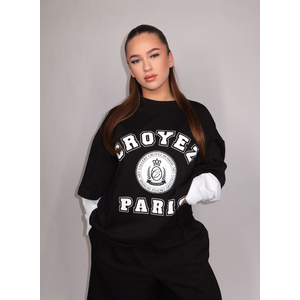 Deze zwarte longsleeve voor dames kenmerkt zich door het layered design met witte onderarmstukken die een contrast vormen met het zwarte bovendeel. Op de borst prijken de teksten "CROYEZ" en "PARIS" in witte letters, vergezeld van een cirkelvormig embleem met kroon. Het shirt heeft een ronde hals en een relaxte pasvorm die comfort en stijl combineert. De vintage black kleur geeft het kledingstuk een tijdloze uitstraling die je streetwear garderobe verrijkt.