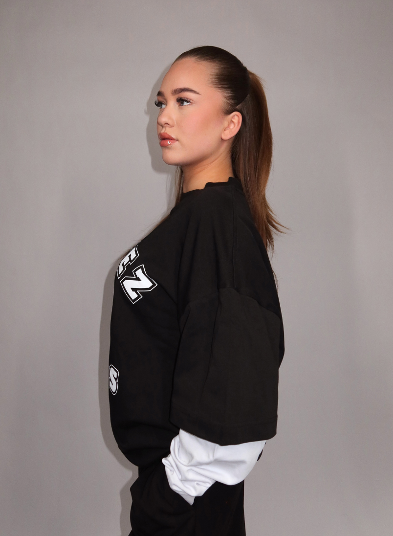 Dit Croyez longsleeve shirt draagt relaxed door de oversized fit. De zwart-witte kleurcombinatie past bij verschillende looks, van sportief tot casual streetwear. Het layered effect met de witte mouwen voegt een trendy dimensie toe aan je outfit.