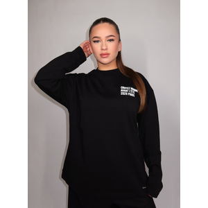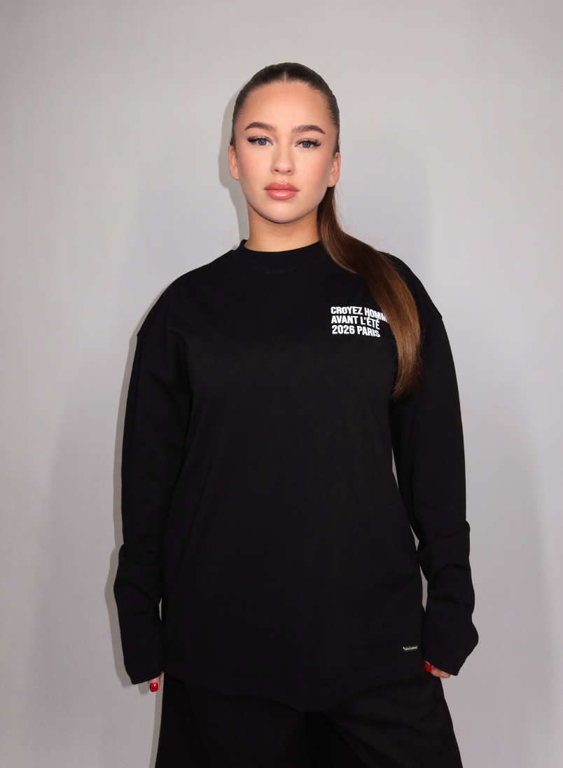 Deze zwarte longsleeve voor dames kenmerkt zich door een klassieke ronde halslijn en lange mouwen met comfortabele ribboorden. Op de linkerborst staat een compacte witte tekstprint met "CROYEZ HOMME AVANT L'ÉTÉ 2026 PARIS". De achterzijde toont een opvallende hartvormige grafische print met het woord "CROYEZ", aangevuld met de tekst "AVANT L'ÉTÉ 2026 PARIS". Het shirt heeft een relaxte pasvorm die je bewegingsvrijheid geeft.
