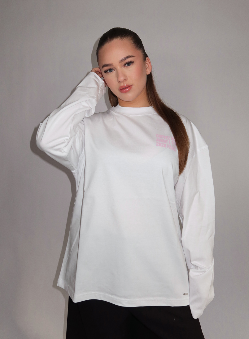 Deze witte longsleeve voor dames kenmerkt zich door een klassieke ronde halslijn en lange mouwen met ribboorden aan de polsen. Op de achterkant staat een opvallende roze hartvormige print met daarin de tekst "CROYEZ", aangevuld met "AVANT L'ÉTÉ 2026 PARIS" eronder. De voorzijde heeft dezelfde tekst in kleinere roze letters op de linkerborst. Het shirt heeft een rechte pasvorm en valt tot op de heupen. De zachte jersey stof zorgt voor optimaal draagcomfort tijdens je dagelijkse activiteiten.