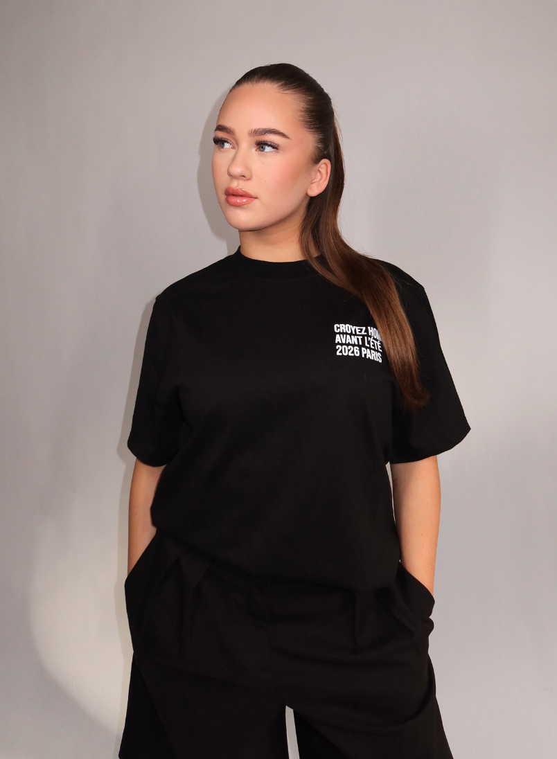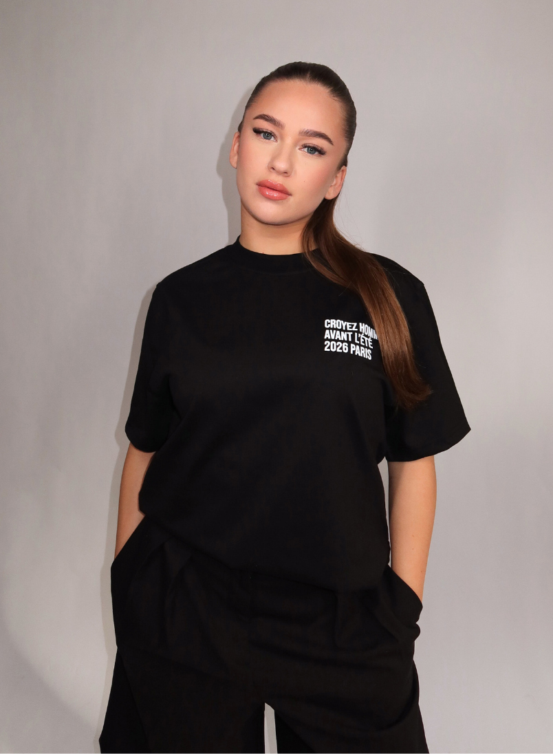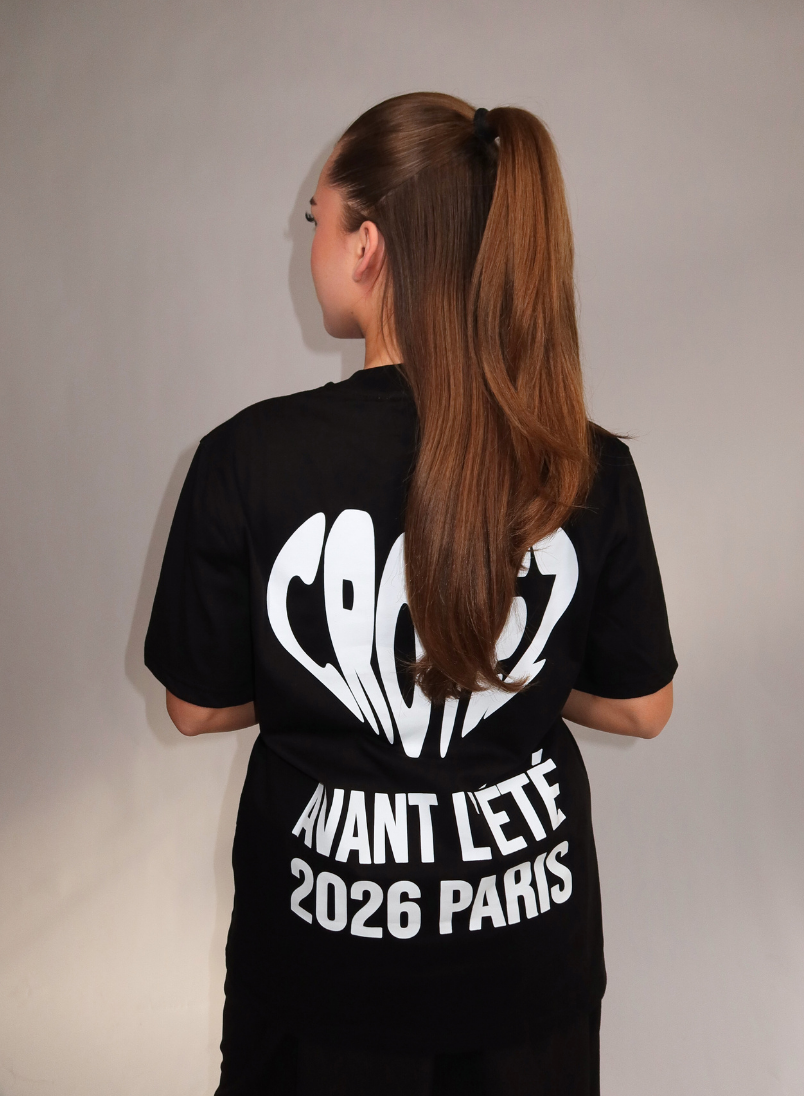 Dit zwarte dames t-shirt van Croyez combineert een relaxte pasvorm met stijlvolle details. Het shirt heeft een klassieke ronde hals en korte mouwen voor optimaal draagcomfort. Op de borst staat subtiele witte tekstopdruk met "CROYEZ HOMME AVANT L'ÉTÉ 2026 PARIS". De achterzijde toont een opvallende hartvormige CROYEZ-print met daaronder "AVANT L'ÉTÉ 2026 PARIS" in witte letters. De oversized fit zorgt voor een moderne, comfortabele uitstraling die perfect past bij je streetwear collectie.