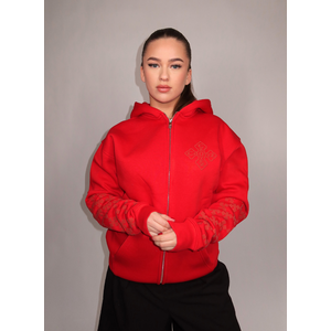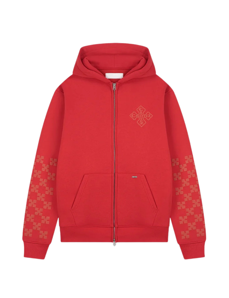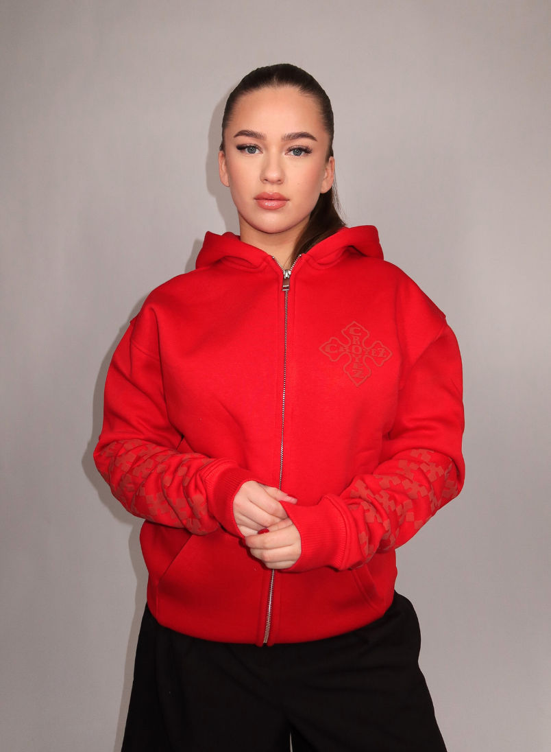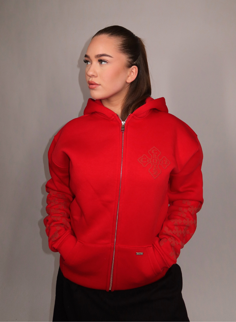 Deze rode dames hoodie van Croyez combineert sportieve stijl met opvallende details. Het kruisvormige logo op de borst geeft deze zip-up hoodie een herkenbare look. De doorlopende ritssluiting maakt hem praktisch in gebruik, terwijl de capuchon je extra comfort biedt. Twee steekzakken aan de voorzijde zorgen voor functionaliteit. Het all-over kruispatroon op de mouwen creëert een subtiel maar onderscheidend accent in dezelfde rode tint. De ribboorden bij de manchetten en zoom zorgen voor een perfecte aansluiting.