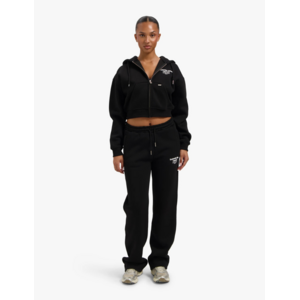 Dit zwarte trainingspak voor dames bestaat uit een cropped hoodie met doorritsluiting en bijpassende joggingbroek. De hoodie heeft een capuchon met koordjes, steekzakken aan de voorzijde en elastische boorden bij de zoom. Op de borst staat "Fraternité Officiel CROYEZ" geprint in witte letters. De joggingbroek heeft een elastische tailleband met koordjes en dezelfde tekstprint op het bovenbeen. Beide delen hebben een relaxed fit die je bewegingsvrijheid geeft tijdens het sporten of loungen.