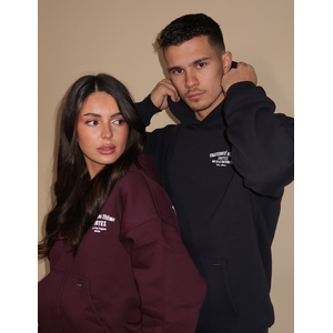 Dit burgundy trainingspak voor dames combineert sportieve looks met streetwear style. De cropped hoodie heeft een doorlopende ritssluiting, capuchon en kangoeroezakken aan de voorzijde. Op de rug staat "Fraternité Ultime CROYEZ" met "Frères Pour Toujours" en "PAYS BAS" in witte letters geprint. De bijpassende joggingbroek heeft een elastische tailleband met trekkoord en een relaxte pasvorm. Beide delen zijn uitgevoerd in zachte katoen blend voor optimaal draagcomfort.