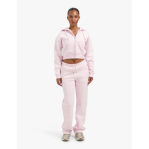 Dit roze trainingspak van Croyez combineert sportieve stijl met vrouwelijke elegance. De cropped hoodie heeft een doorlopende ritssluiting, capuchon met trekkoord en steekzakken aan de voorzijde. Op de borst staat "Fraternité" geprint in witte letters. De bijpassende joggingbroek heeft een elastische tailleband met trekkoord en valt recht over de benen. Beide delen zijn uitgevoerd in zachte sweatstof voor optimaal draagcomfort tijdens je sportieve én casual momenten.