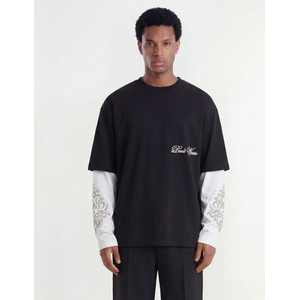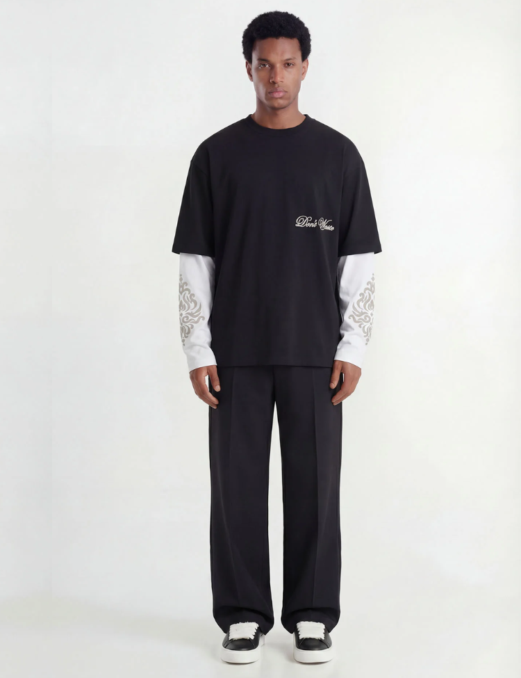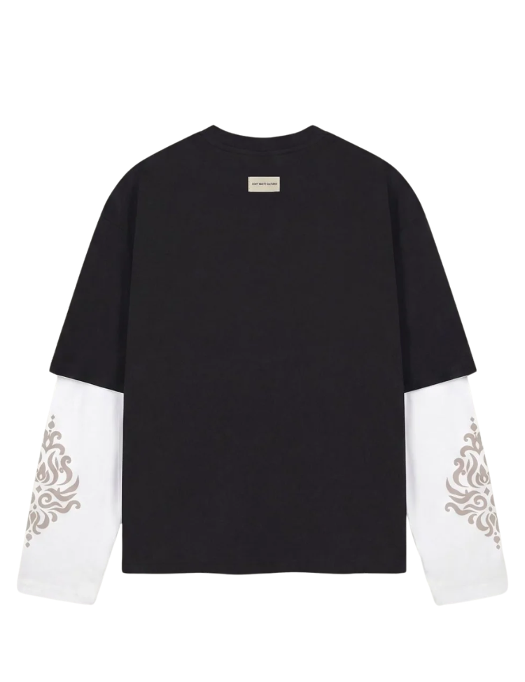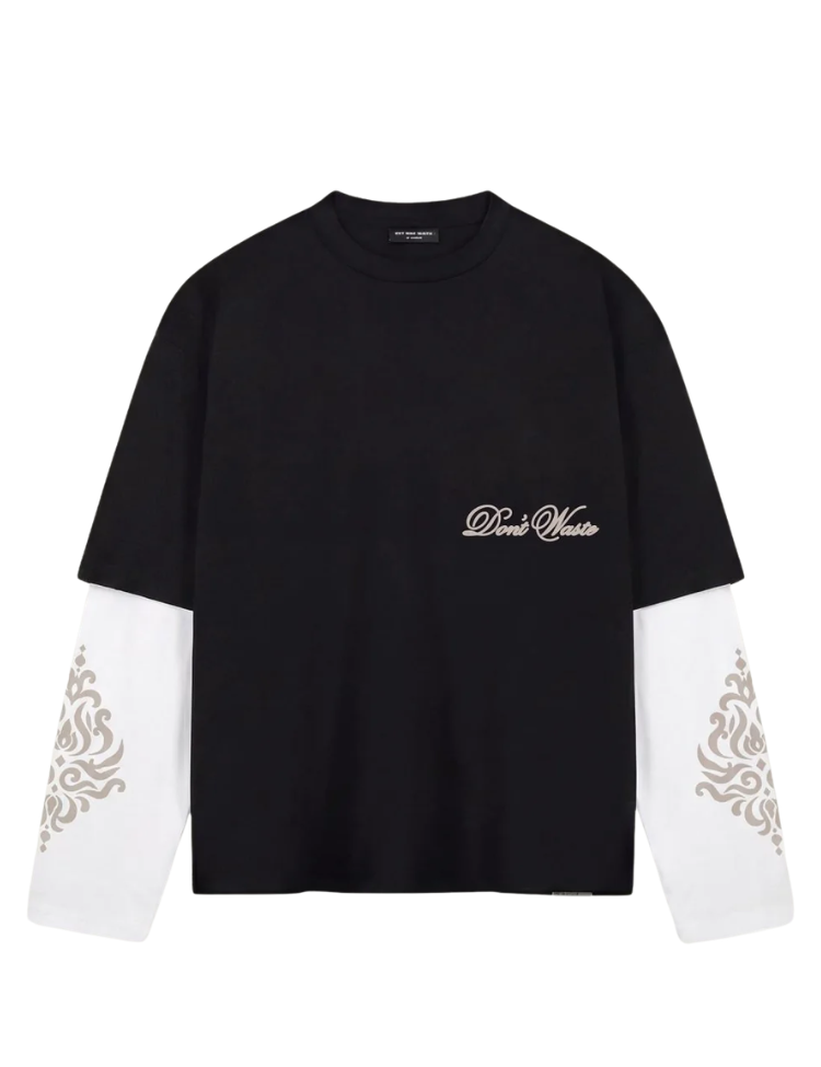 Zwarte longsleeve met opvallend layered design. Het bovenstuk heeft een relaxte, oversized pasvorm met ronde hals en korte zwarte mouwen. Daaronder witte lange mouwen met sierlijke grafische prints. Op de borst staat "Don't Waste" in cursief script. Aan de achterzijde zit een geweven labeltje bij de nek.