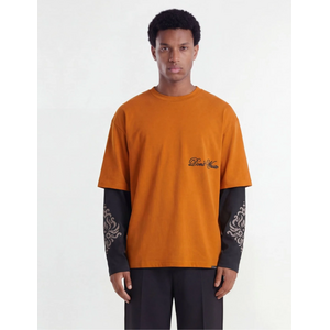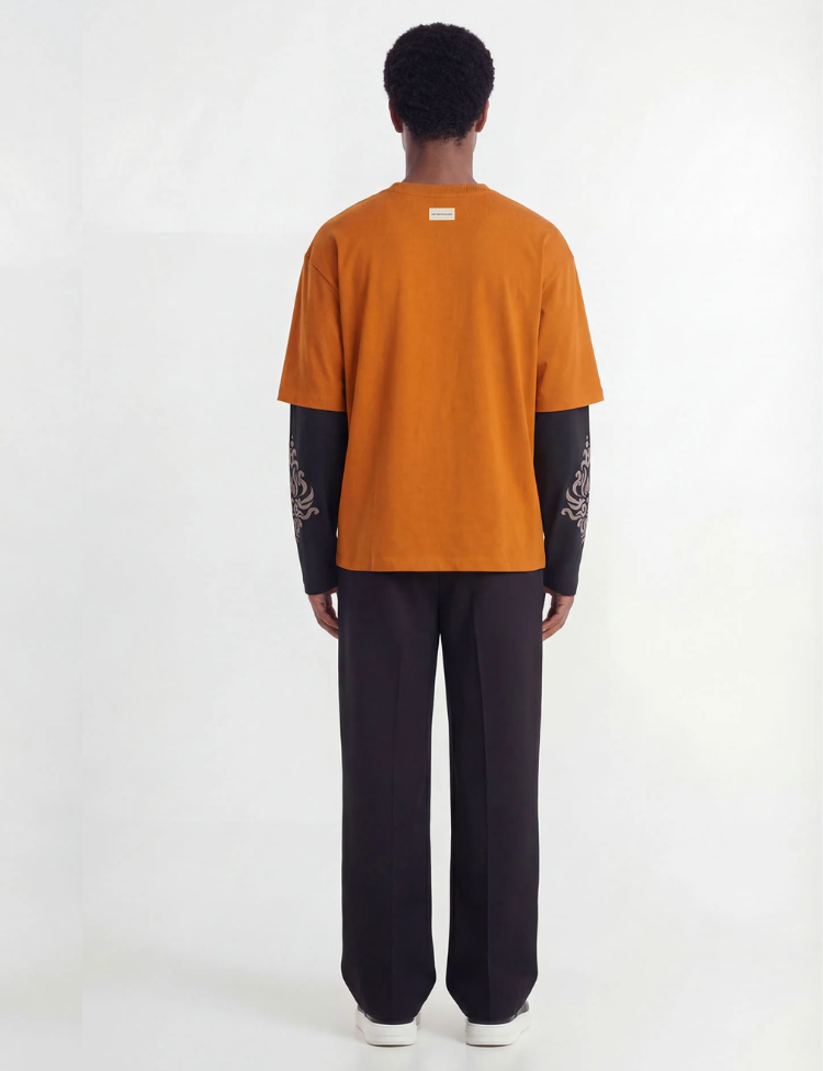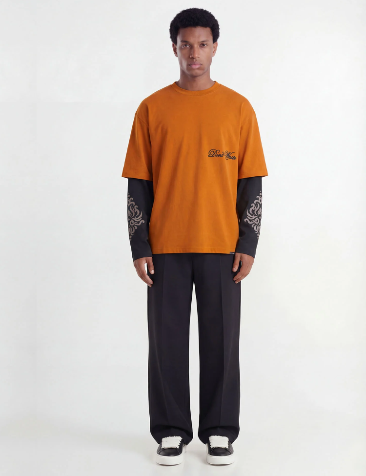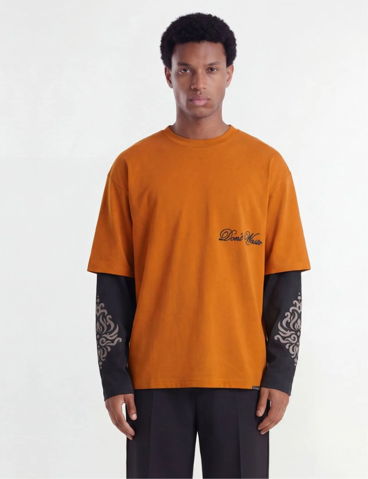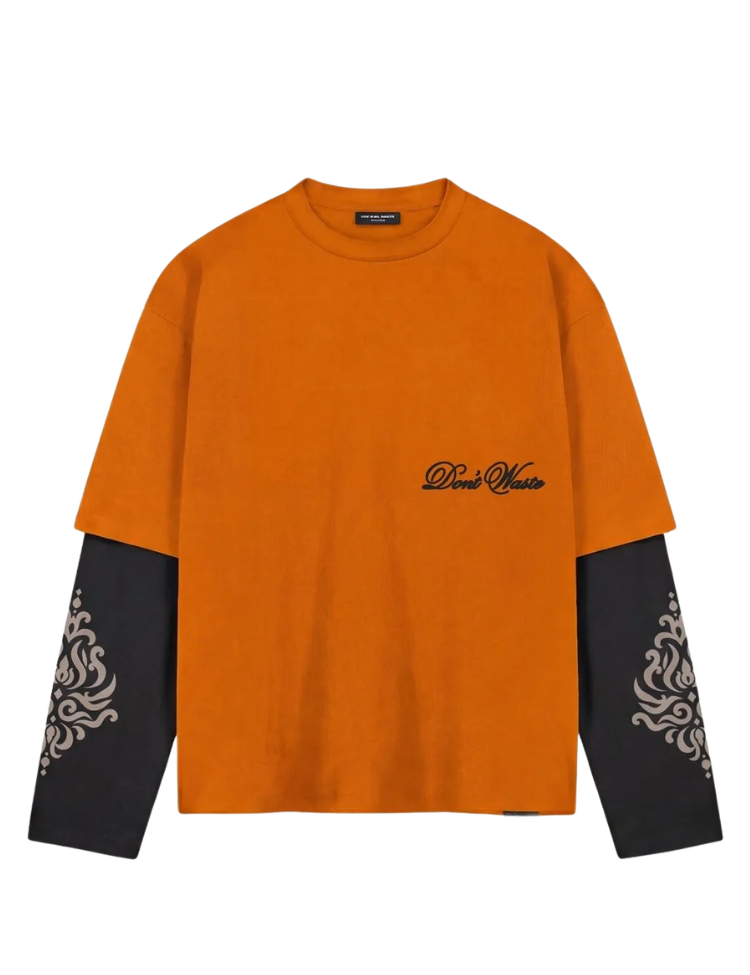 Oranje longsleeve met een opvallend layered design. De bovenlaag heeft korte, oversized mouwen in oranje met op de borst een "Don't Waste" script print. De onderlaag bestaat uit zwarte lange mouwen met sierlijke grafische prints. Aan de achterzijde zit een klein geweven label bij de kraag. Ronde hals en een relaxte pasvorm geven dit shirt direct karakter.