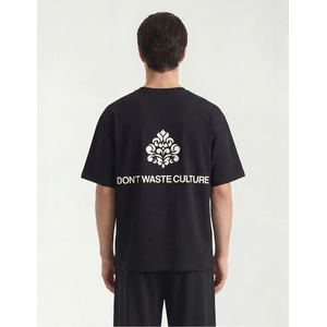 Dit zwarte t-shirt van Don't Waste Culture heeft een relaxte oversized fit met dropped shoulders voor een comfortabel draaggevoel. Op de borst zie je een compact ornamenteel logo in wit, terwijl de achterkant een groter matching design toont met daaronder de merknaam "DON'T WASTE CULTURE". Het shirt heeft een klassieke ronde hals en is gemaakt van soepel katoen dat lekker draagt. De metalen branding bij de zoom geeft het een premium afwerking. Perfect voor wie houdt van minimalistische streetwear met karakter.