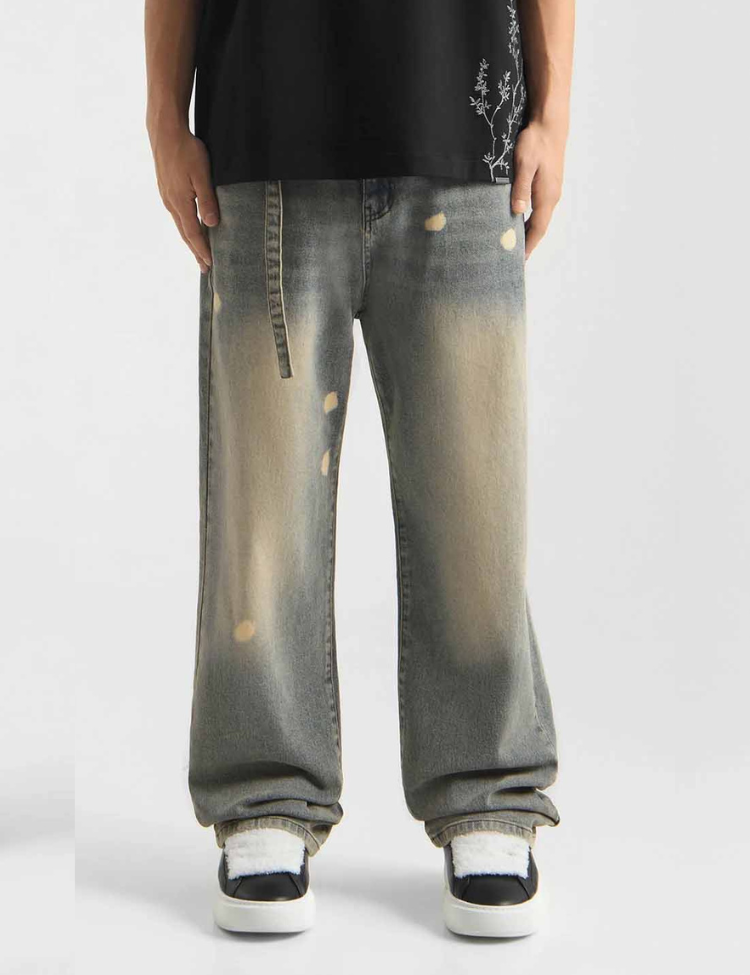 Deze pale blue denim broek heeft een opvallende wassing met lichte verfspetters over het gehele oppervlak. De jeans is voorzien van vijf zakken en een riemsluiting met metalen knoop en ritssluiting. Op de achterzak zie je een geborduurd bloemmotief dat subtiel terugkomt. De rechte pijpen en normale taillehoogte zorgen voor een relaxte pasvorm die je dagelijks draagt.