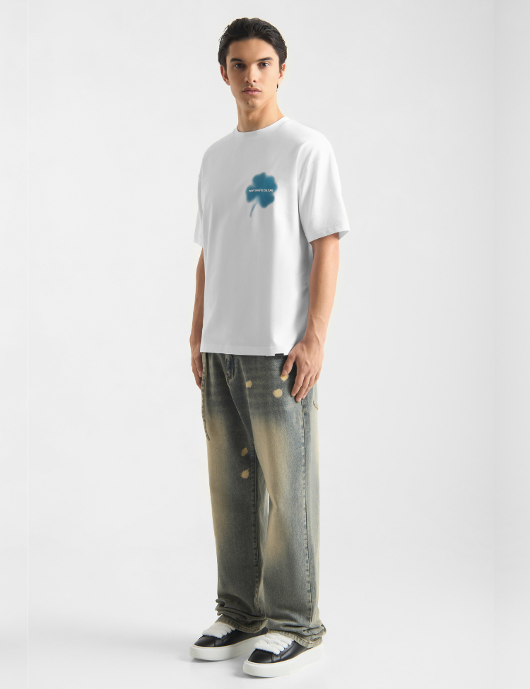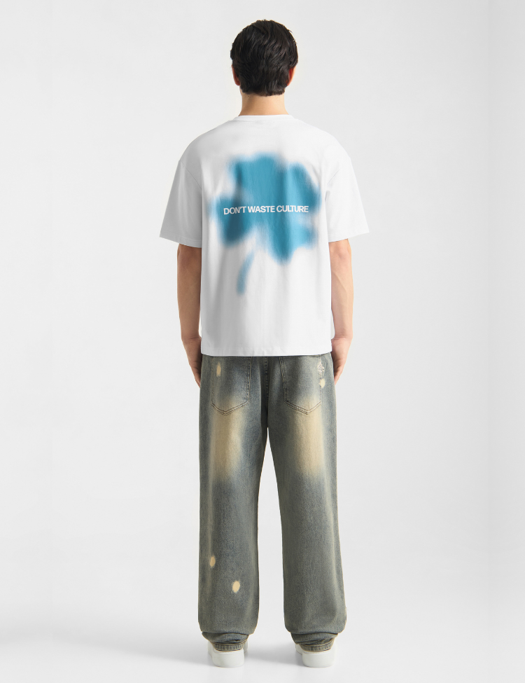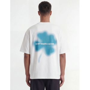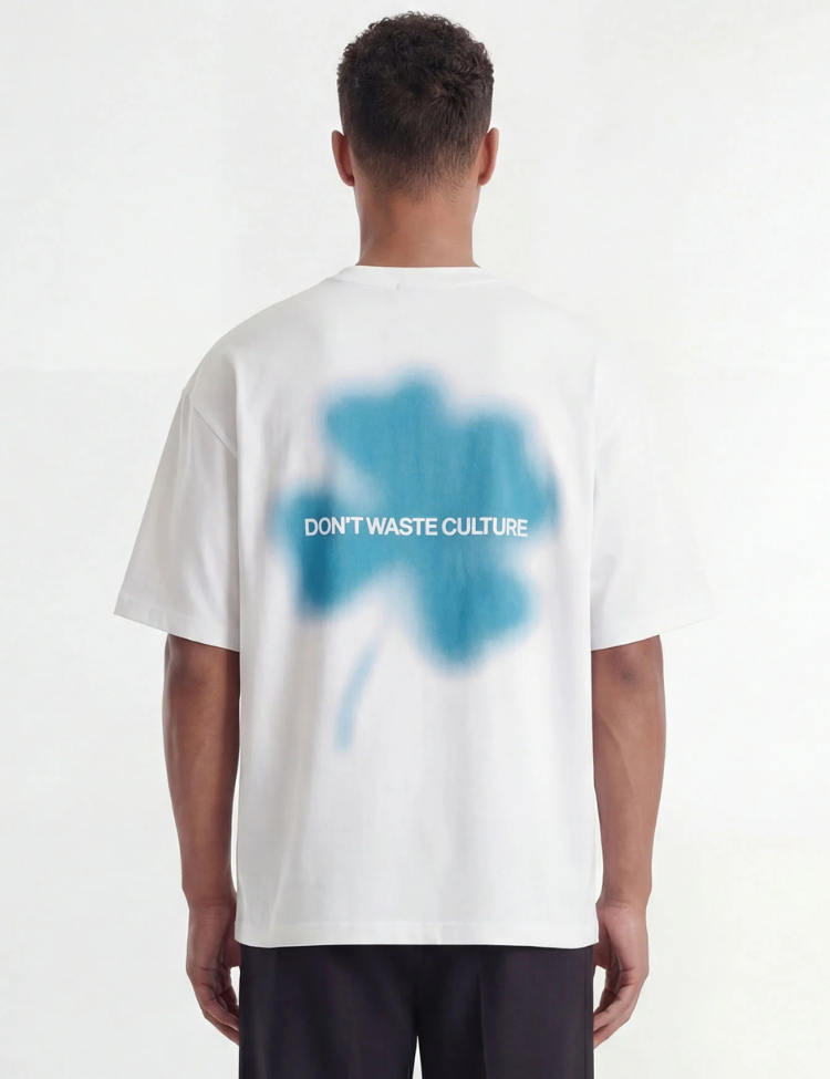 Wit T-shirt met relaxed fit en ronde hals in een comfortabele, stevige stof. Op de borst een blauw spray-effect klaverprint met de tekst "Don't Waste Culture". Op de rug keert dezelfde print groter terug met opnieuw de merknaam in witte letters. De korte mouwen hebben een dropped shoulder snit die het shirt een modern, oversized silhouet geeft.
