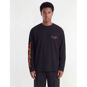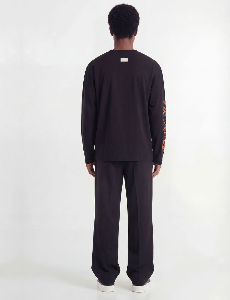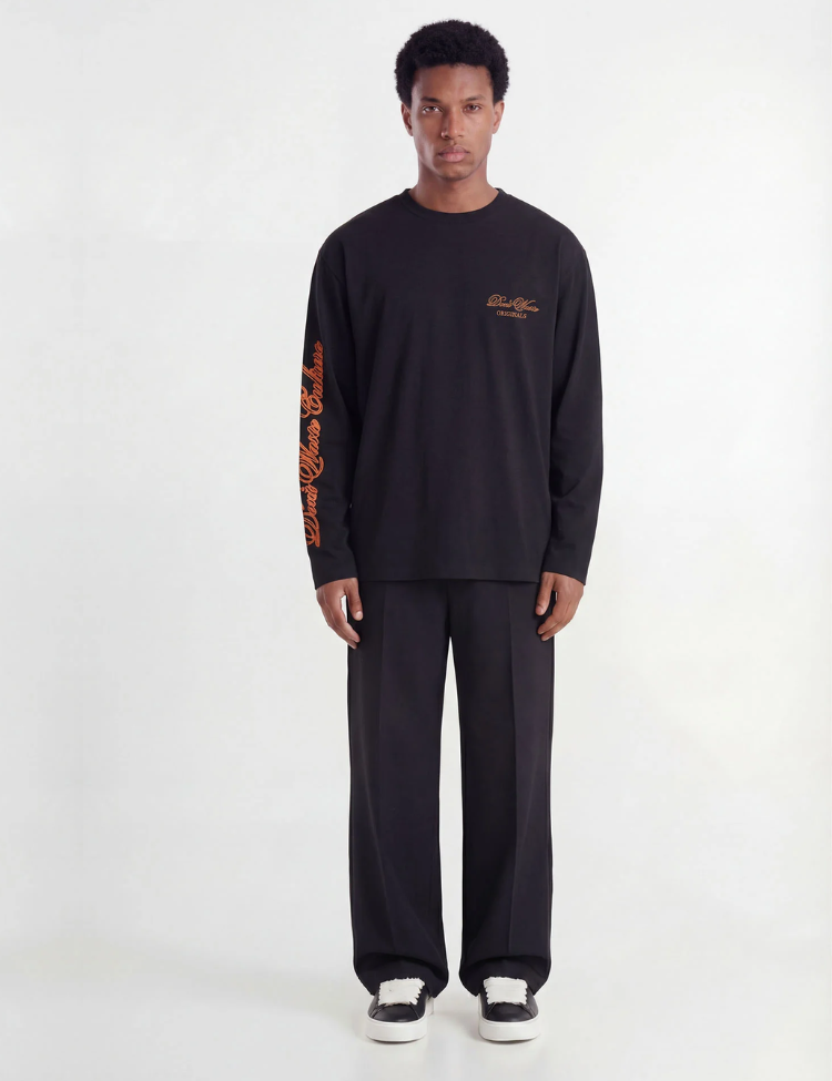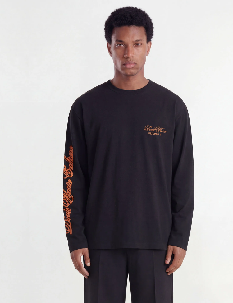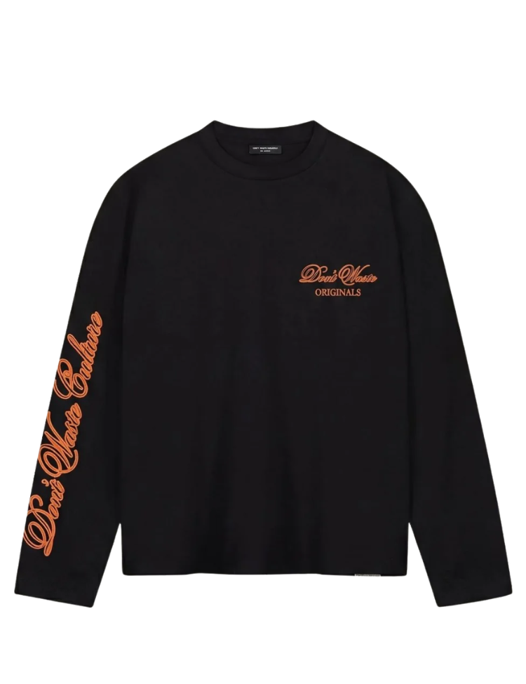 Zwart longsleeve shirt met ronde hals en relaxed fit. Op de linkerborst staat in oranje sierletters "Don't Waste Culture Originals" geprint. Over de rechter mouw loopt een opvallende oranje scriptprint met de tekst "Don't Waste Culture". Aan de achterzijde van de kraag zit een geweven label met merkbranding. De longsleeve heeft een strakke, urban uitstraling die je look direct karakter geeft.