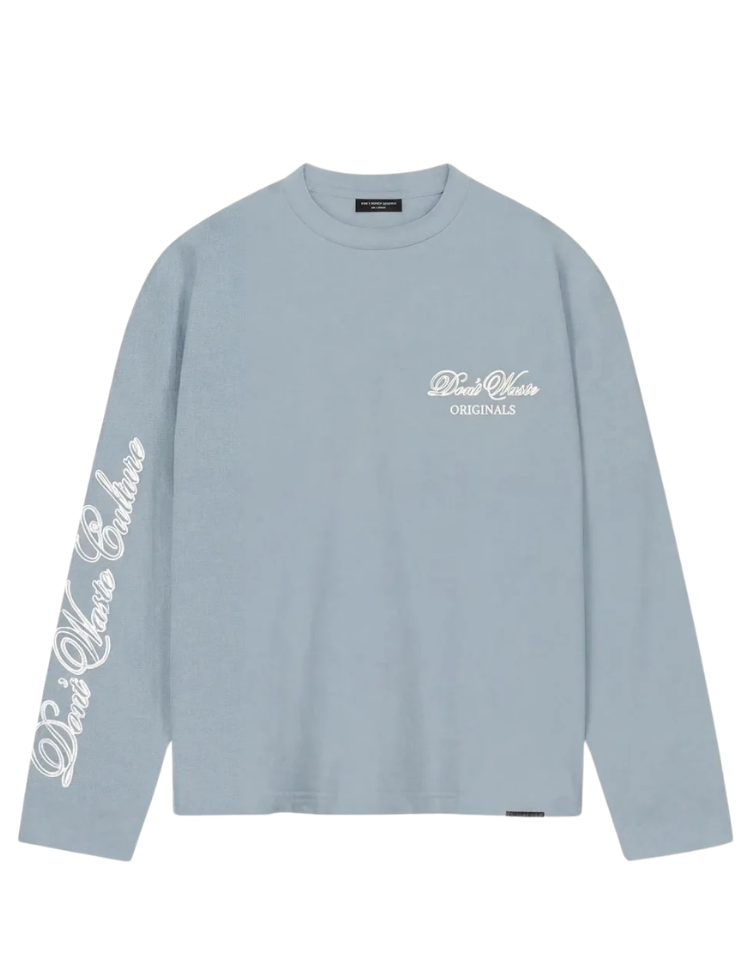 Lichtblauw longsleeve shirt met ronde hals en relaxte pasvorm. Op de borst staat de tekst "Don't Waste Culture Originals" in sierlijke witte letters. Over de rechter mouw loopt dezelfde merknaam in groot, cursief script. Aan de achterzijde zit een geweven label in de nek. Comfortabel shirt met lange mouwen dat karakter toevoegt aan je dagelijkse look.