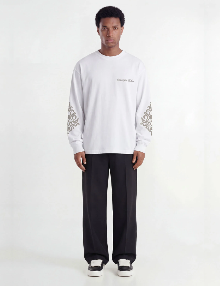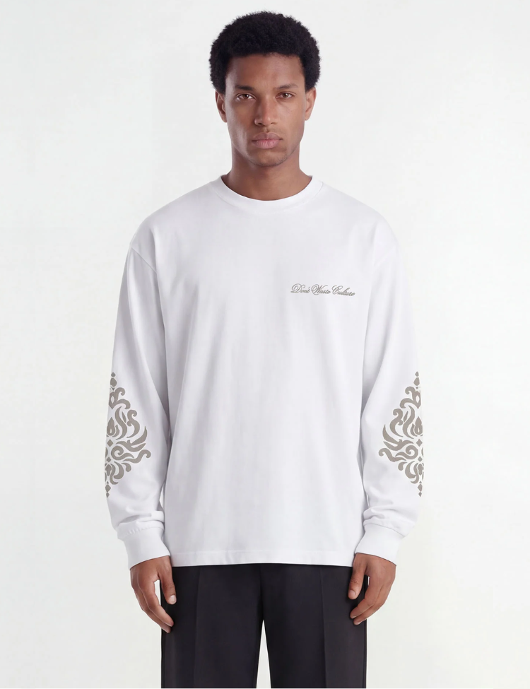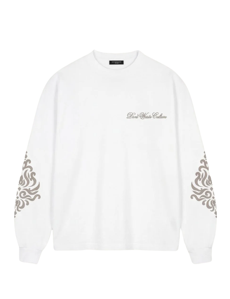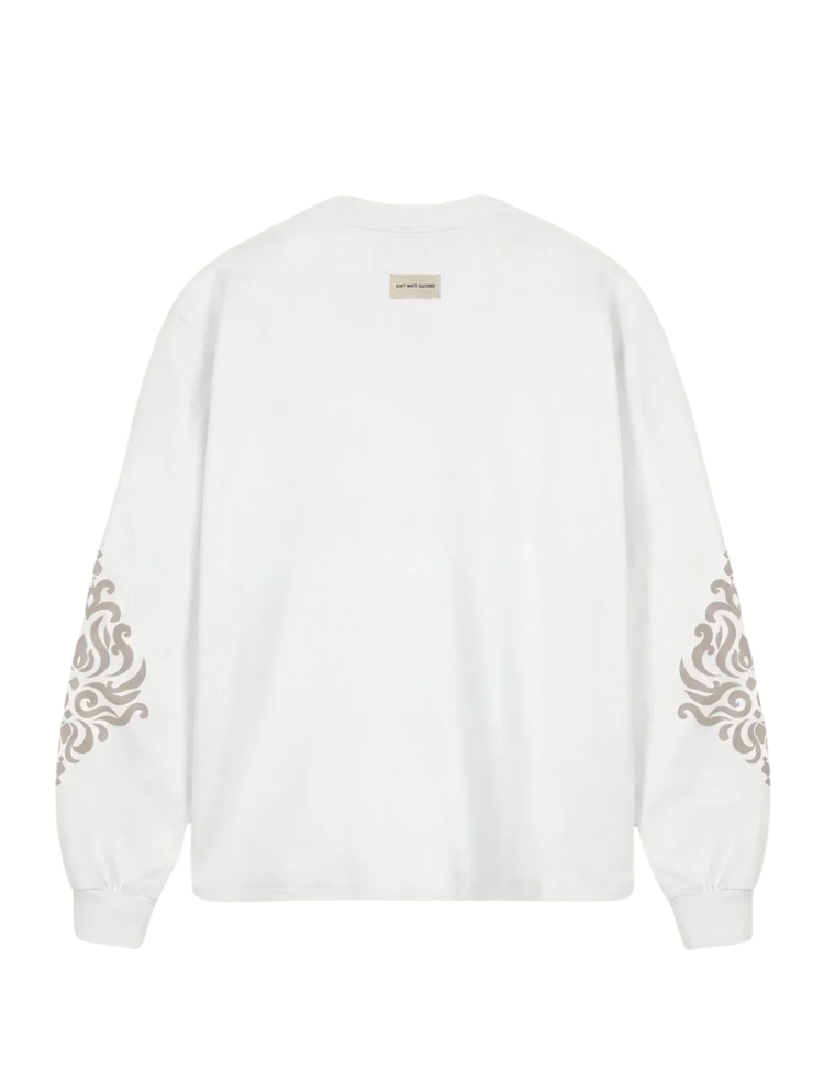 Deze off white longsleeve van Don't Waste Culture heeft een relaxte pasvorm met een ronde hals en elastische boorden bij de mouwen. Op de borst staat de merknaam in sierlijk cursief schrift. De mouwen zijn voorzien van opvallende ornamentale prints in een zandkleurige tint. Aan de achterzijde zit een geweven label met branding net onder de kraag.