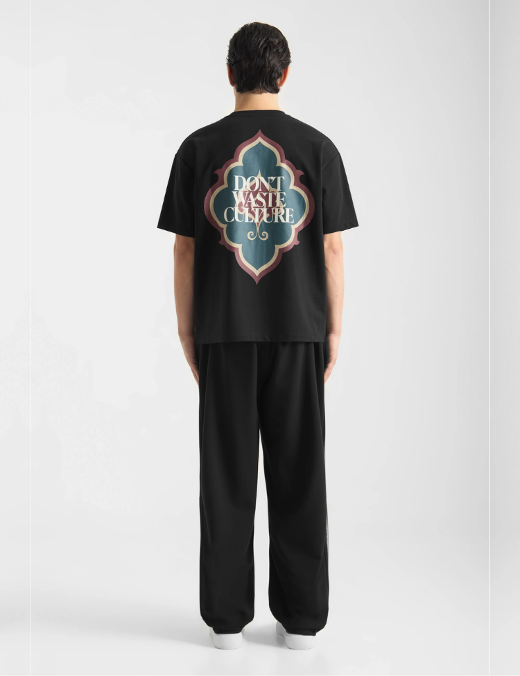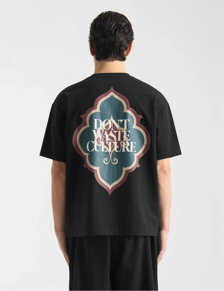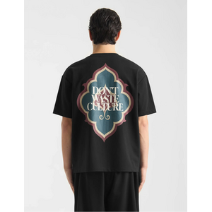Dit zwarte t-shirt kenmerkt zich door een opvallende grafische print op zowel de borst als rug. Het relaxed fit shirt heeft korte mouwen en een ronde hals. Op de voorkant staat een compact ornamentaal design met de tekst "Don't Waste Culture" in een decoratief kader. De achterzijde toont dezelfde tekst in een groter, uitgewerkt motief met blauwe, roze en crème tinten. Het metalen labeltje bij de zoom geeft het shirt een premium afwerking.