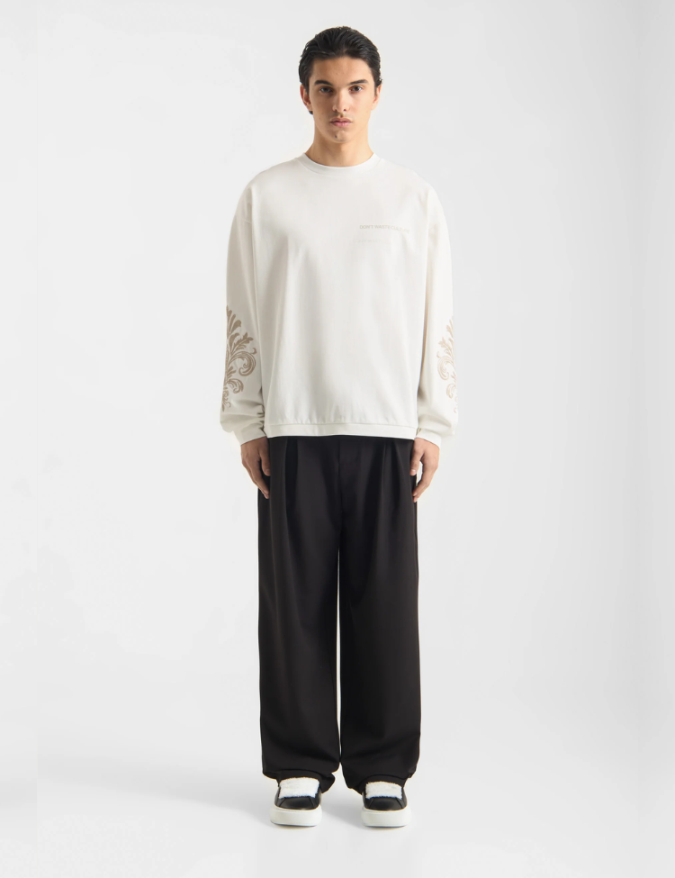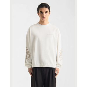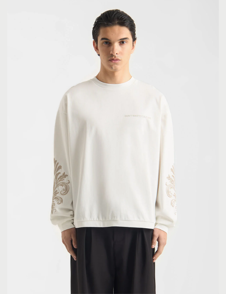 Deze off white sweater heeft een relaxte pasvorm met ronde hals en lange mouwen. Het truitje valt op door decoratieve prints op de mouwen in beige tinten met sierlijke krulpatronen. Op de voorkant zie je subtiele tekstopdruk "DON'T WASTE CULTURE" in dezelfde tint als de sweater. De achterkant toont een groot ornamentaal motief in matching beige kleur. Het zachte materiaal voelt comfortabel aan en de ribboorden bij de hals, mouwen en zoom zorgen voor een goede afwerking.