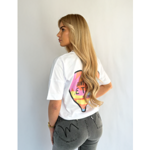 Wit T-shirt met op de achterkant een kleurrijke hartvormige print, gevuld met een abstract patroon in zonnige pastelkleuren. In het midden staat de tekst SAINT TROPEZ JE T’AIME, aangevuld met “LE CLUB” als subtiele verwijzing naar de mondaine Franse badplaats. Een vrolijk en uitgesproken design dat zomerse luxe en speelse romantiek samenbrengt.