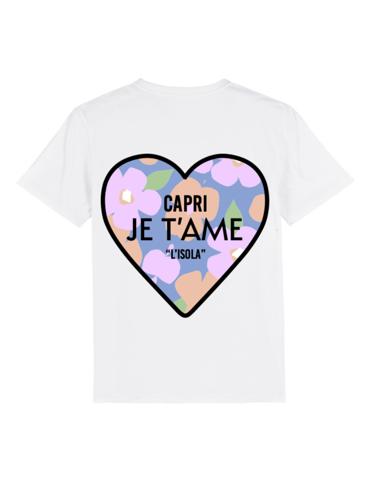 Wit T-shirt met een speelse, kleurrijke hartprint op de rug, gevuld met een bloemrijk patroon in pastelkleuren. Centraal staat de tekst CAPRI JE T’AIME, aangevuld met “L’ISOLA” – een subtiele verwijzing naar het iconische Italiaanse eiland. Een fris en zomers ontwerp dat romantiek, kleur en vakantiegevoel samenbrengt in één uitgesproken item.