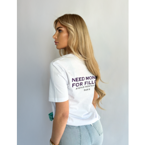 Een stijlvolle knipoog met Parijse allure. Dit minimalistische witte T-shirt valt op door de opvallende paarse tekst “NEED MONEY FOR FILLER” op de achterkant, subtiel aangevuld met de locatie Avenue Montaigne – Paris. Een speelse en modieuze expressie van zelfspot en elegantie – perfect voor wie houdt van fashion met een twist.