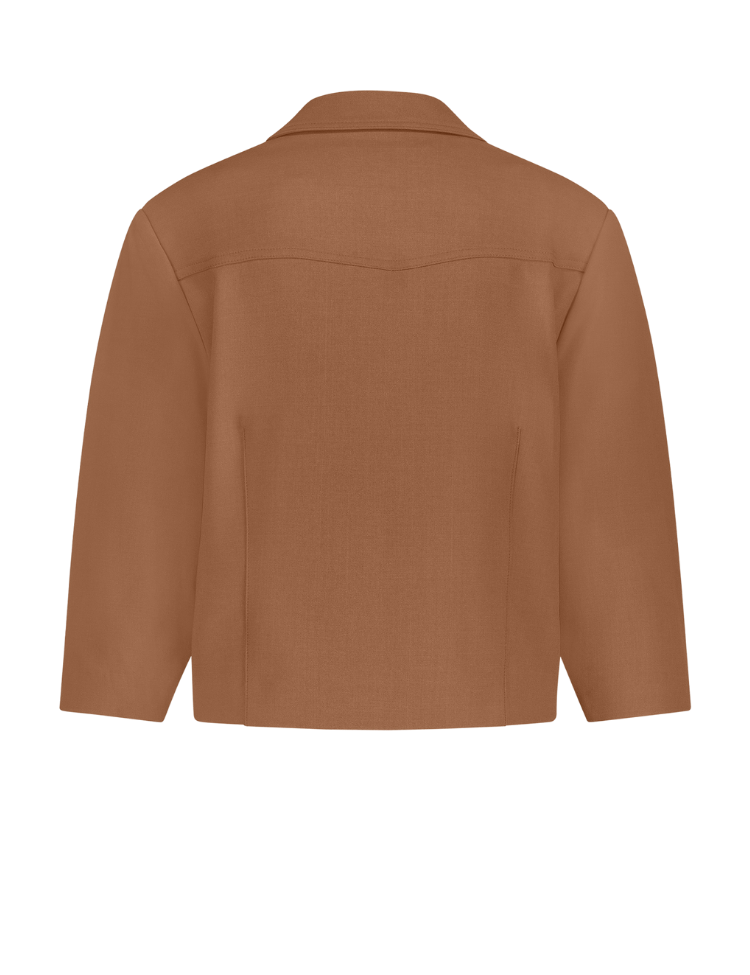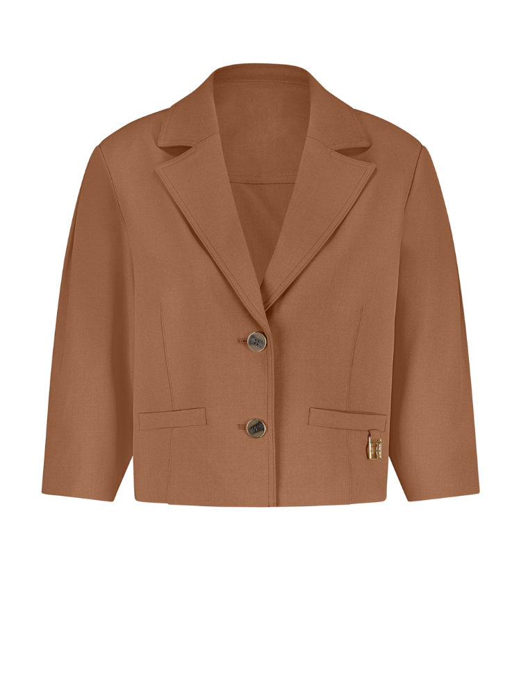 De Fifth House Ivey Top in de kleur Dark Camel is een stijlvolle blazer met een moderne, cropped fit. Deze top is uitgevoerd met een klassieke reverskraag, dubbele knoopsluiting en lange mouwen met lichte plooival. De getailleerde pasvorm zorgt voor een elegante en vrouwelijke uitstraling, terwijl de warme camel tint het item veelzijdig maakt voor diverse gelegenheden. De blazer is voorzien van twee sierzakken aan de voorzijde en een subtiel goudkleurig Fifth House-logo bij de zoom.