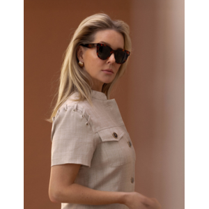 De Izzie Dress van Fifth House is een moderne interpretatie van utility chic. Deze korte jurk heeft een recht, licht getailleerd silhouet met een minimalistische opstaande kraag en een doorknoopsluiting aan de voorzijde. De subtiele textuur van de stof geeft het ontwerp een verfijnde uitstraling, terwijl de korte mouwen en de schouderdetails met goudkleurige eyelets en rijgkoord een speelse en edgy twist toevoegen.
