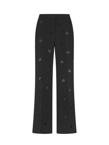 De pantalon heeft een middelhoge taille, een rechte pasvorm en is net als de blazer gedetailleerd met fijne strepen en een elegant logopatroon. De rits- met haak- en oogsluiting zorgt voor een nette en gestroomlijnde fit, terwijl de zakken functionaliteit toevoegen zonder in te boeten op stijl.