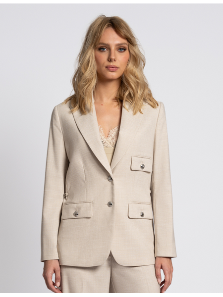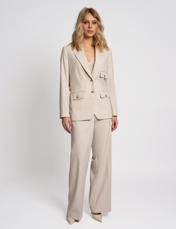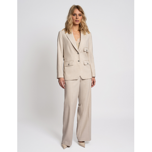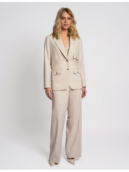 De Juliete Pants van Fifth House is een elegante high-waisted pantalon in een luxe Camel/Gold Melange stof met subtiele glans. De rechte, wijde pijpen en de asymmetrische tailleband met knoop geven deze broek een moderne en vrouwelijke uitstraling. Gemaakt van een comfortabele, licht rekbare kwaliteit met ingestikte persvouwen voor een chique silhouet. Perfect te combineren met blouses, blazers of een casual top – van office look tot dinnerdate.