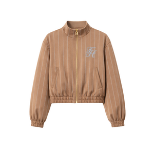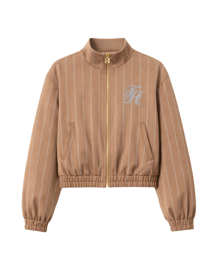 Deze korte bomberjack van Fifth House komt in een warme cinnamonkleur met verticale krijtstrepentekening. Het vest heeft een staande kraag en sluit met een goudkleurige ritssluiting aan de voorzijde. Aan de linkerborstzijde vind je een geborduurd FH logo in blauw en wit. De ballon mouwen en het elastische boordje aan de zoom en manchetten zorgen voor een relaxte pasvorm. Twee steekzakken aan de voorzijde en subtiele zijsplitten bij de zoom maken het jack compleet.