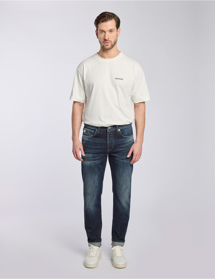 De GoldGarn U2 Tapered Fit Jeans in Dark Blue combineert tijdloos design met een moderne pasvorm. Deze five-pocket jeans heeft een tapered fit wat iets ruimer valt bij de bovenbenen en smal toelopend naar de enkels.