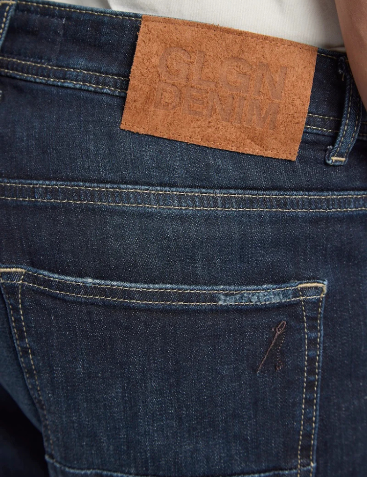 Details zoals de verstopte knoopsluiting, gestikte achterzakken met decoratieve naad, en het leren labelpatch met Goldgarn-logo zorgen voor een hoogwaardige afwerking. De opgestikte logo’s en verfijnde stiksels benadrukken het ambachtelijke karakter van de jeans.