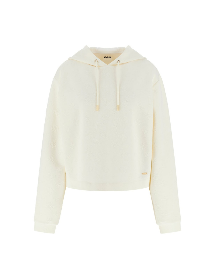 Deze hoodie van Guess is vervaardigd uit een zachte stof met subtiel 3D-peony monogram over het volledige oppervlak. Het model heeft een comfortabele, iets kortere pasvorm en is afgewerkt met een vaste capuchon met verstelbare trekkoorden. Aan de voorkant bevindt zich een klein, ton-sur-ton Guess logo. De ribboorden aan de mouwen en onderzijde zorgen voor extra comfort en pasvormbehoud.