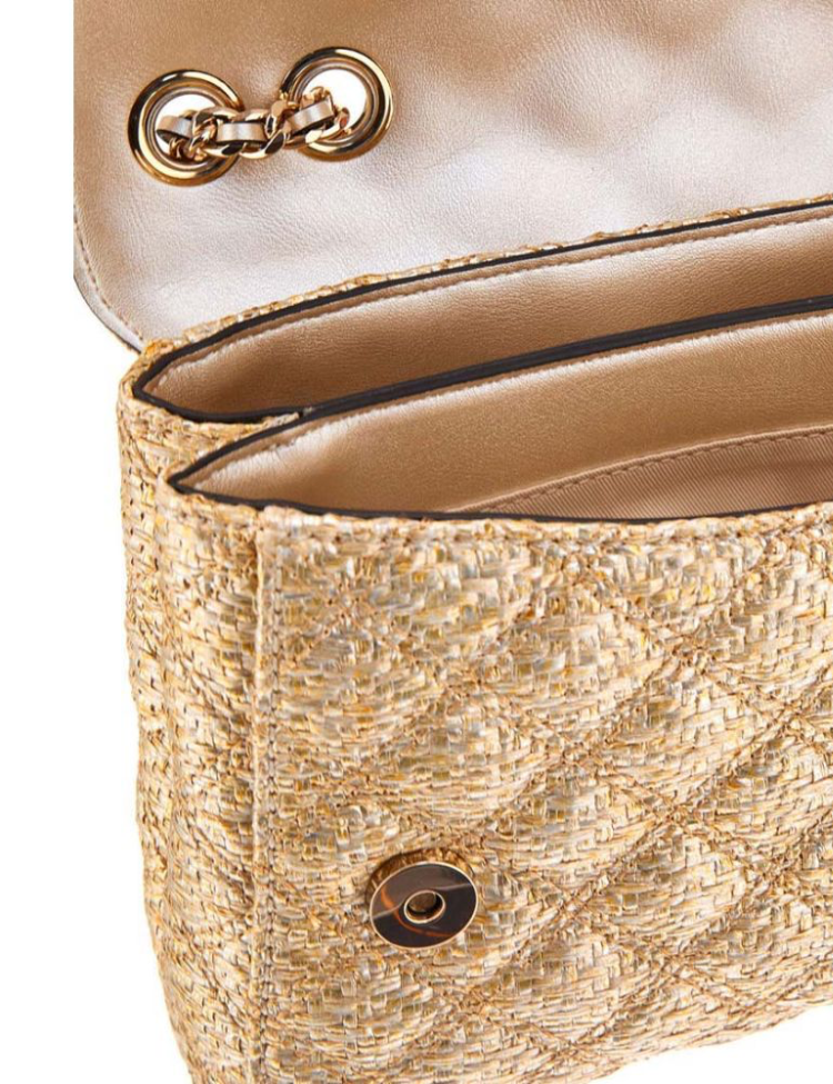 De Guess Giully II Convertible Flap is een elegante schoudertas met een luxe uitstraling in goudkleurig geweven materiaal. De tas heeft twee ruime compartimenten, een flap met magneetsluiting en een schouderband met schakels en leren detail, die zowel lang als kort gedragen kan worden. Ideaal voor een chique avond of een stijlvolle dagelijkse look.